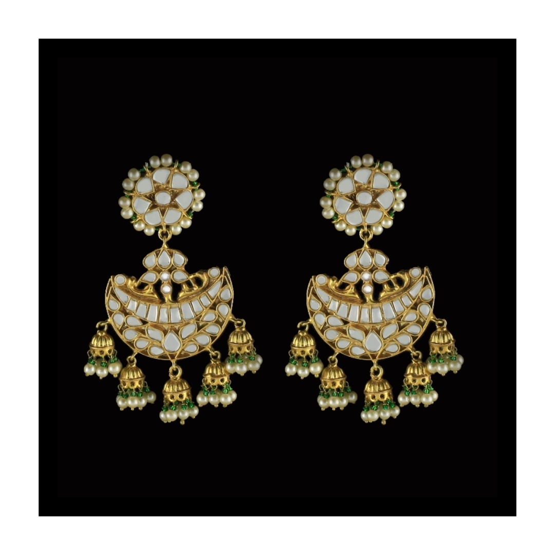 • Gold-plated Sheesha Kundan earrings embossed with fine kundan stones along with white and green pearls finishing.