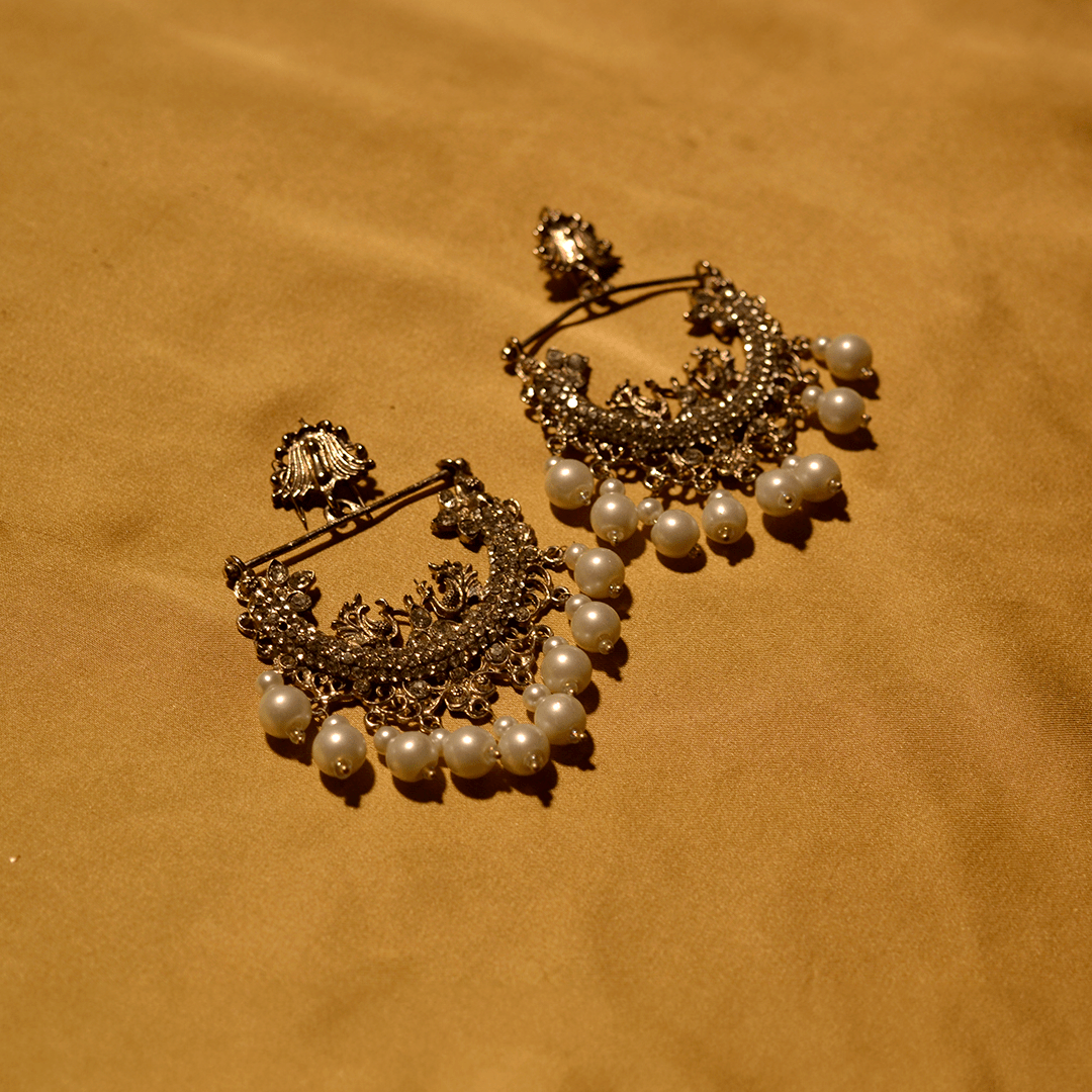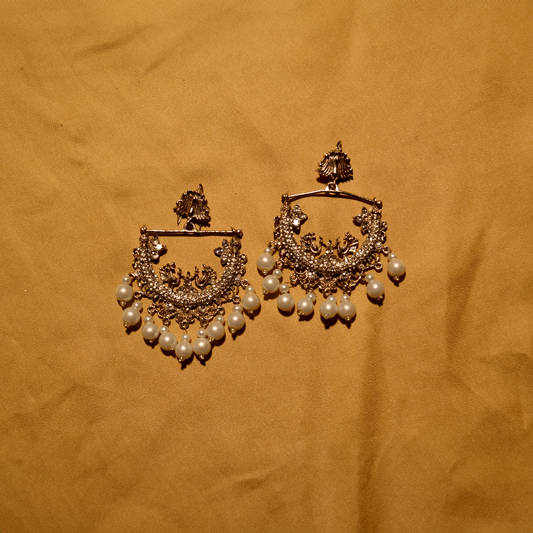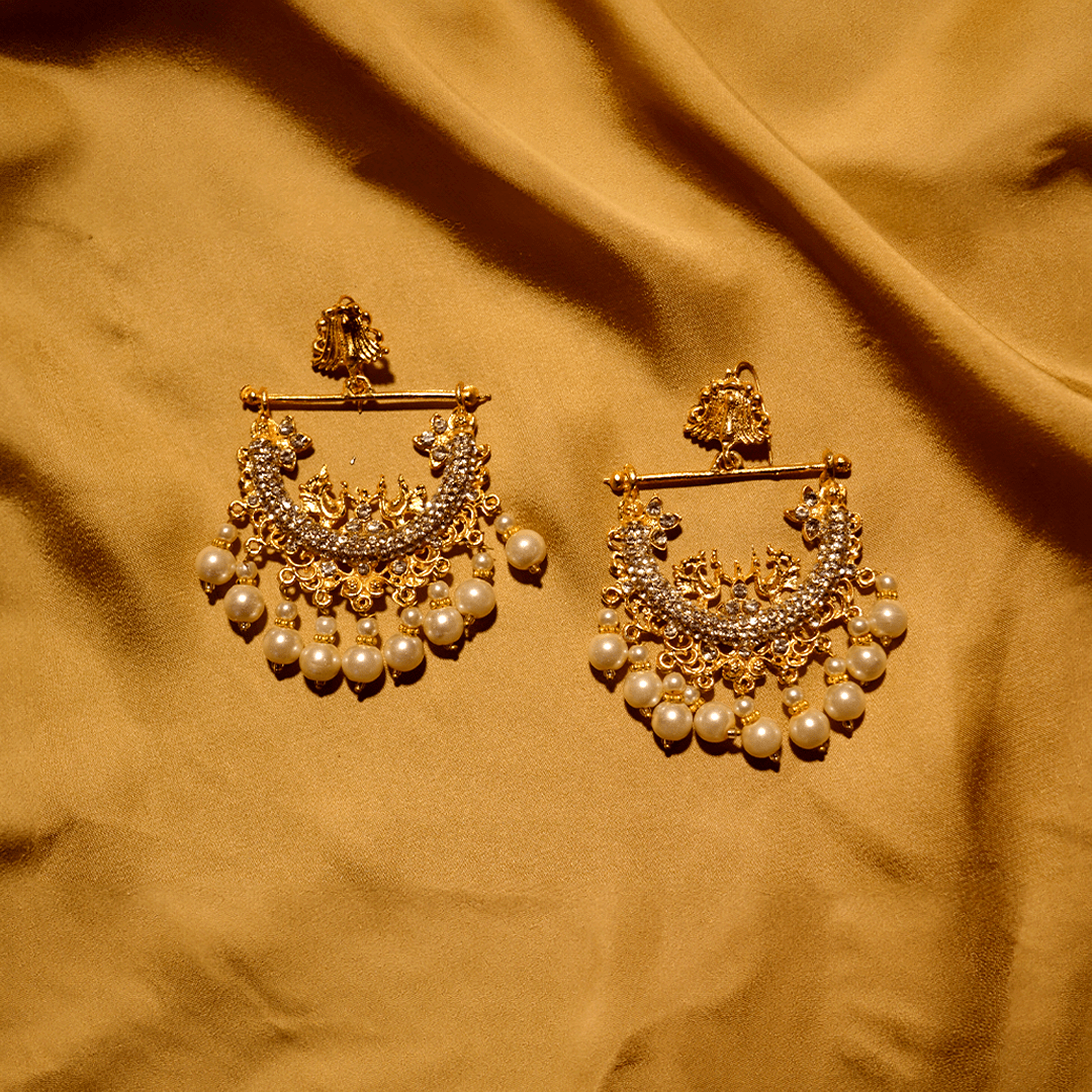 Gold-plated handworked earrings finely embellished with zircon stones and natural pearls.