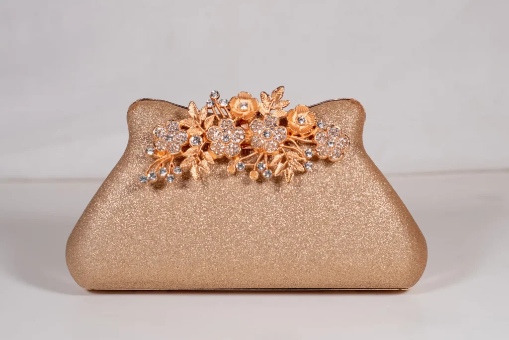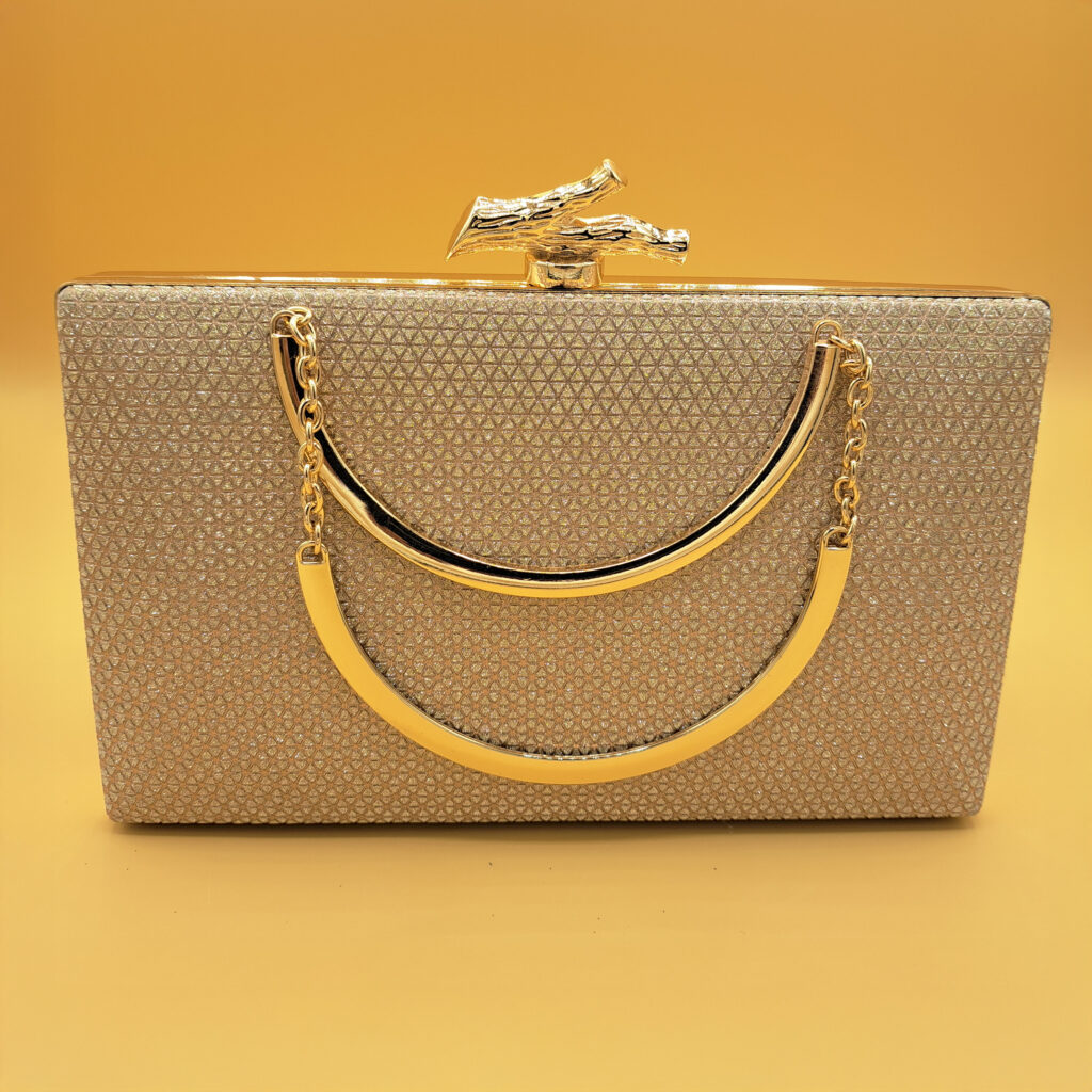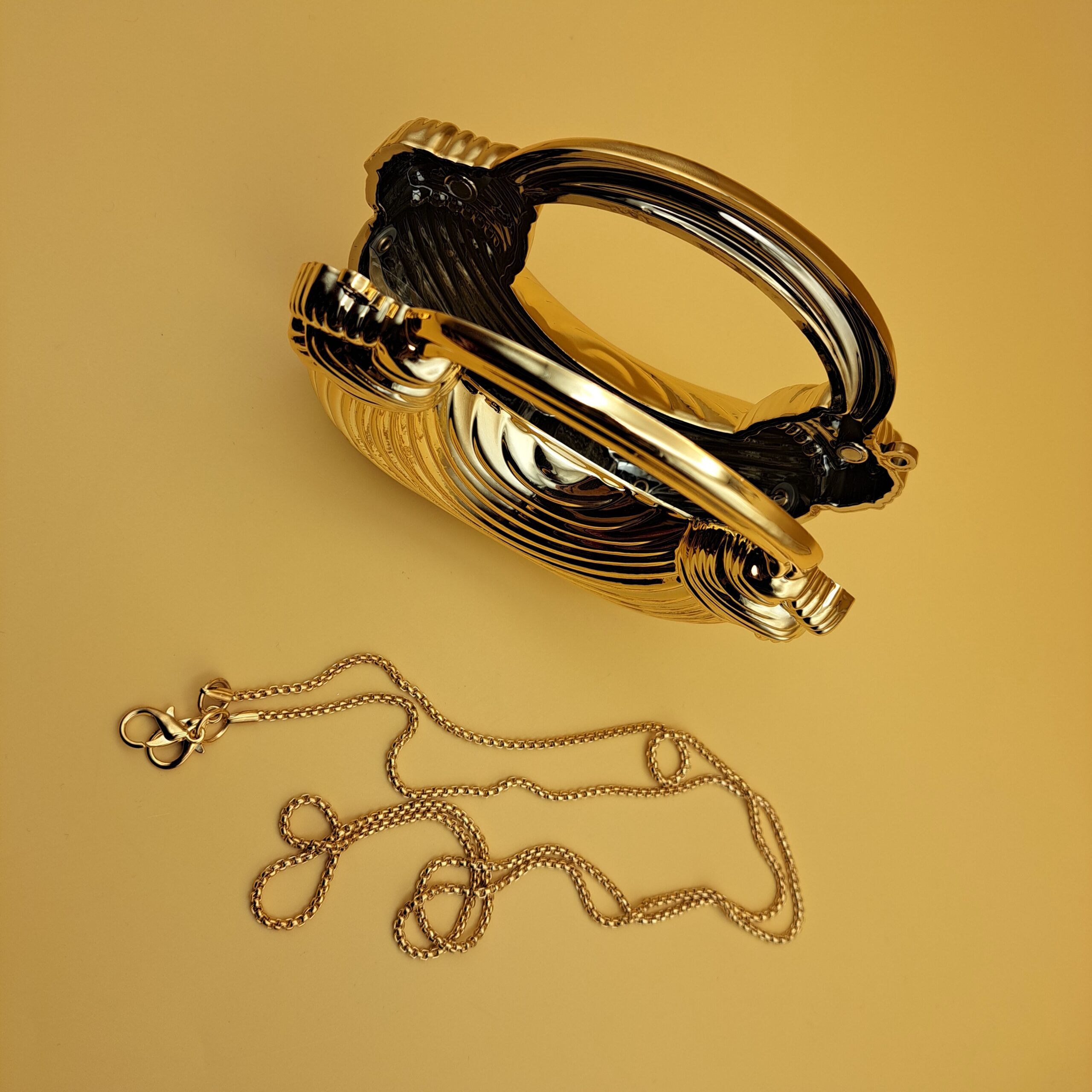 Defined by its structured ring handle and dramatic, engraved lines, this gold metal bag offers a sculptural, modern take on classic glamour. An essential accessory for a high-impact, sophisticated look. It comes with a long gold chain.