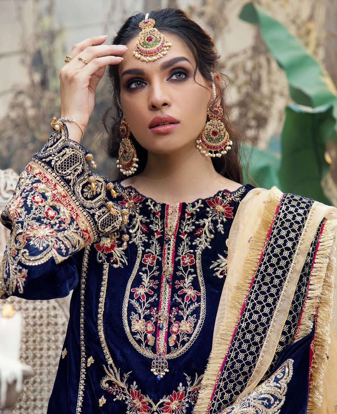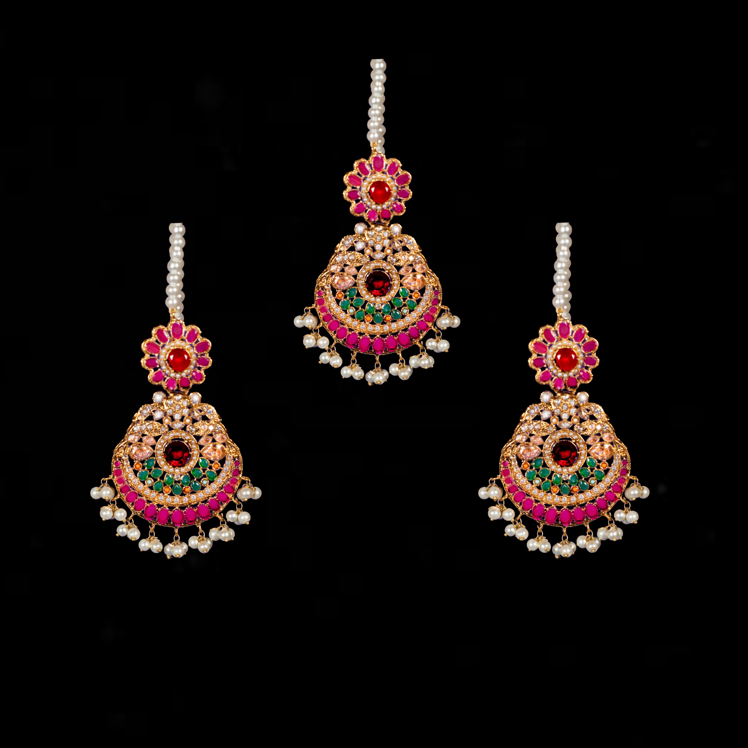• Gold-plated hand-worked earrings and Bindia set  embedded with champagne zircon stones, pink ruby stones, emeralds along with the embellishment of natural and emerald pearls.