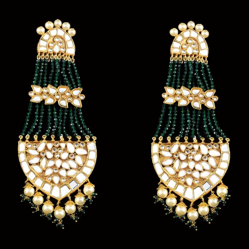 Gold-plated Sheesha Kundan-pearl Jhumar kantay embellished with fine kundan stones with finishing of natural and crystal emerald pearls.