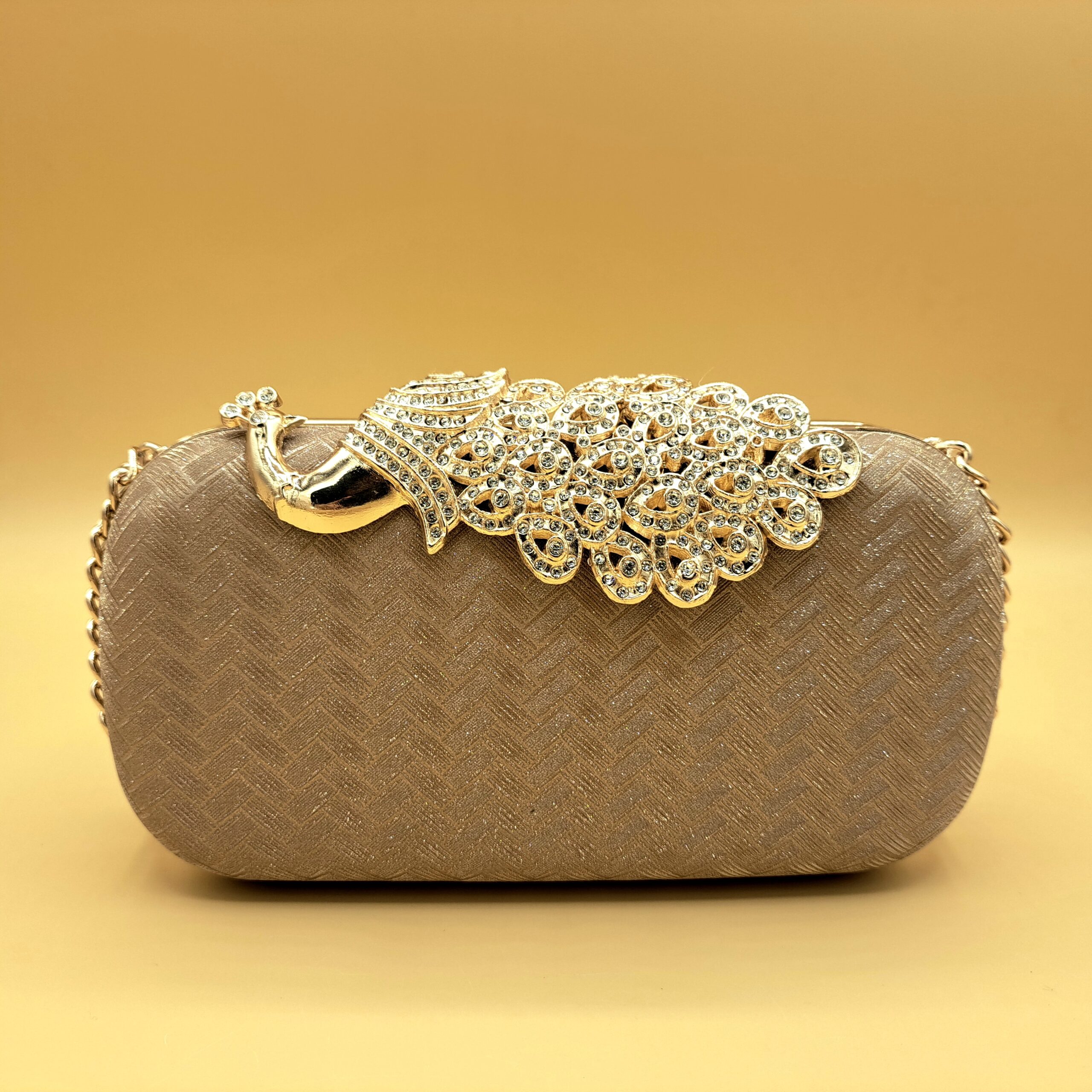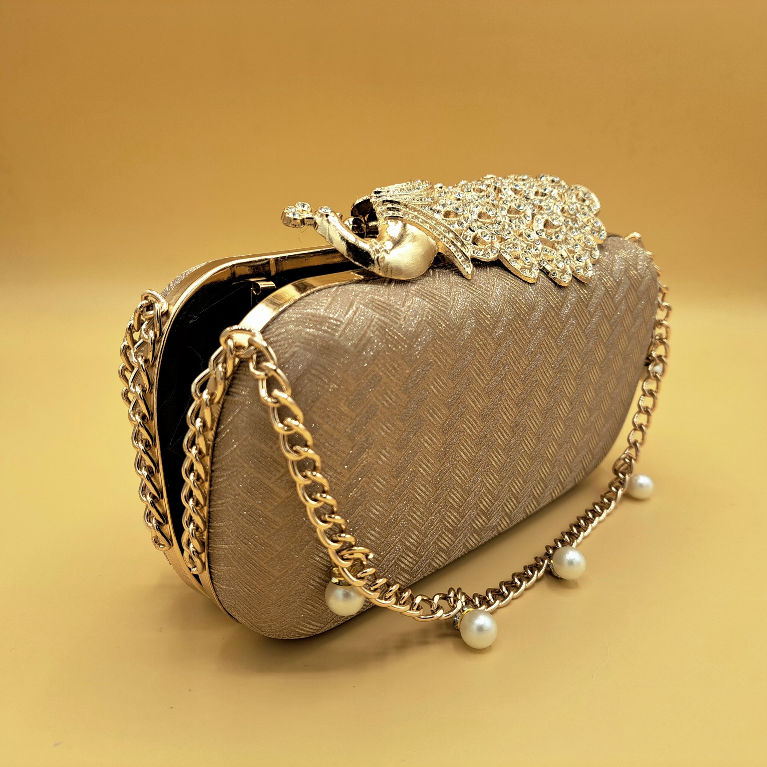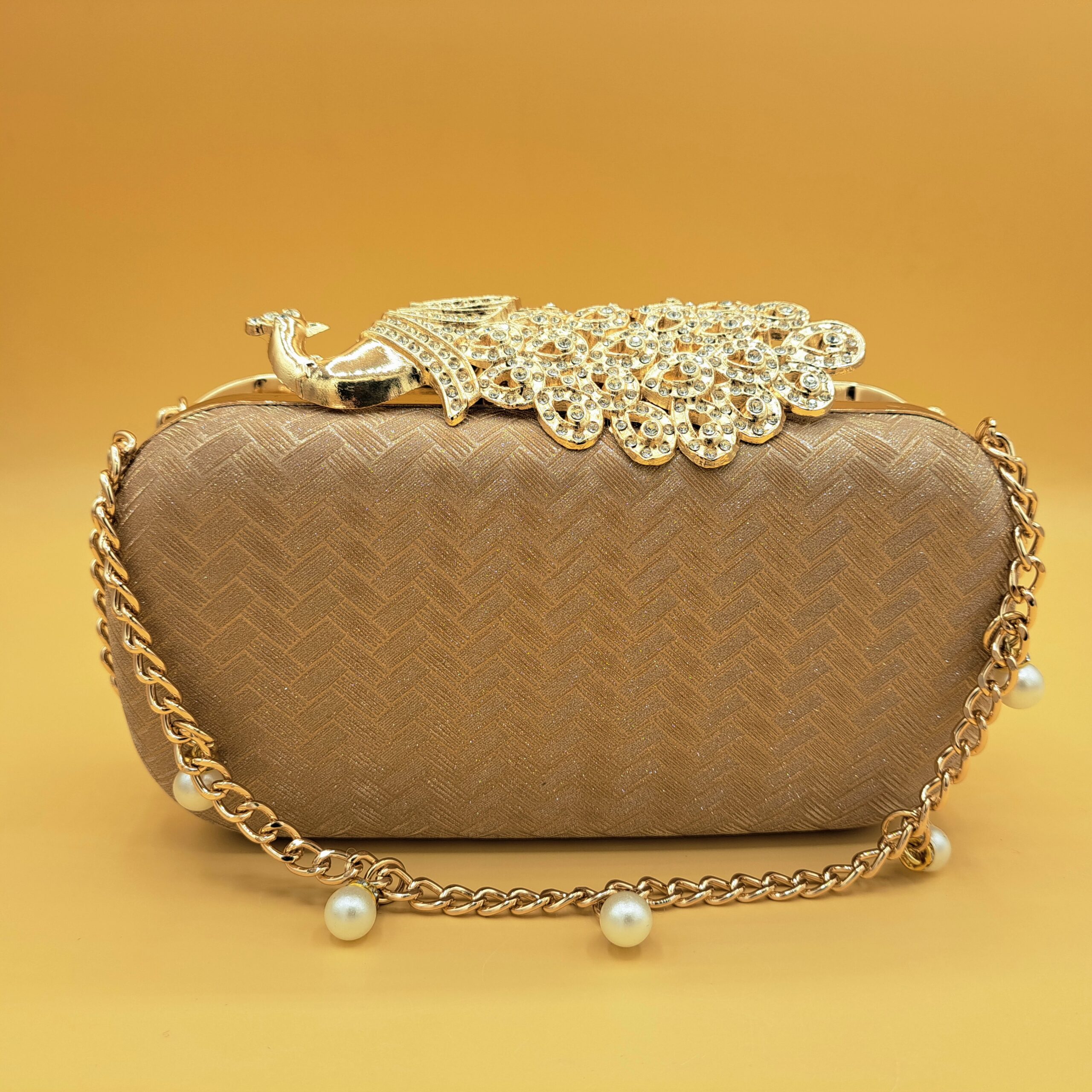 A statement of elegance — this gold-toned clutch features a stunning peacock design encrusted with shimmering stones and a chain hanging. Perfect for weddings and festive occasions, it pairs luxury craftsmanship with timeless charm.