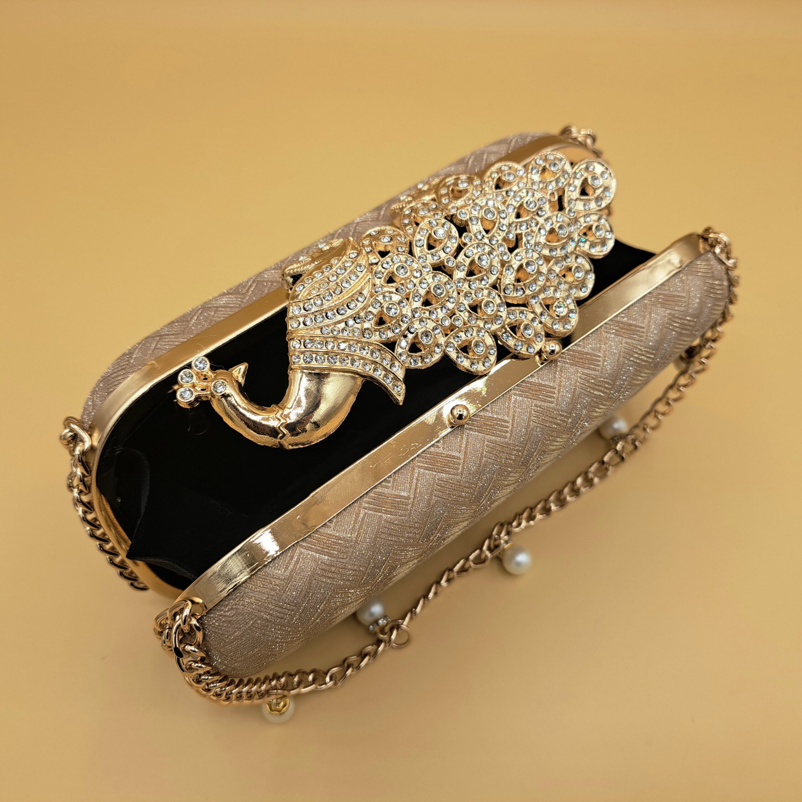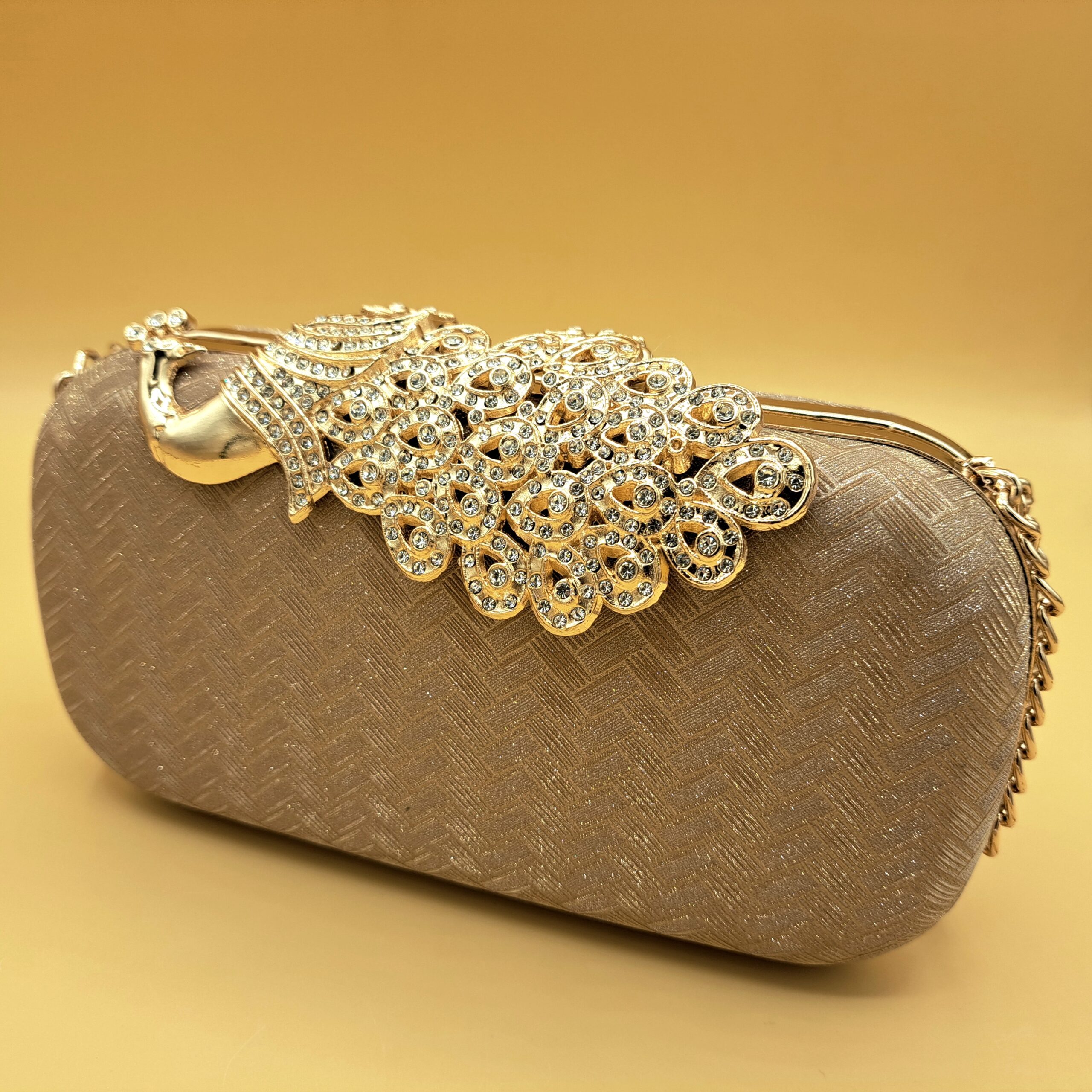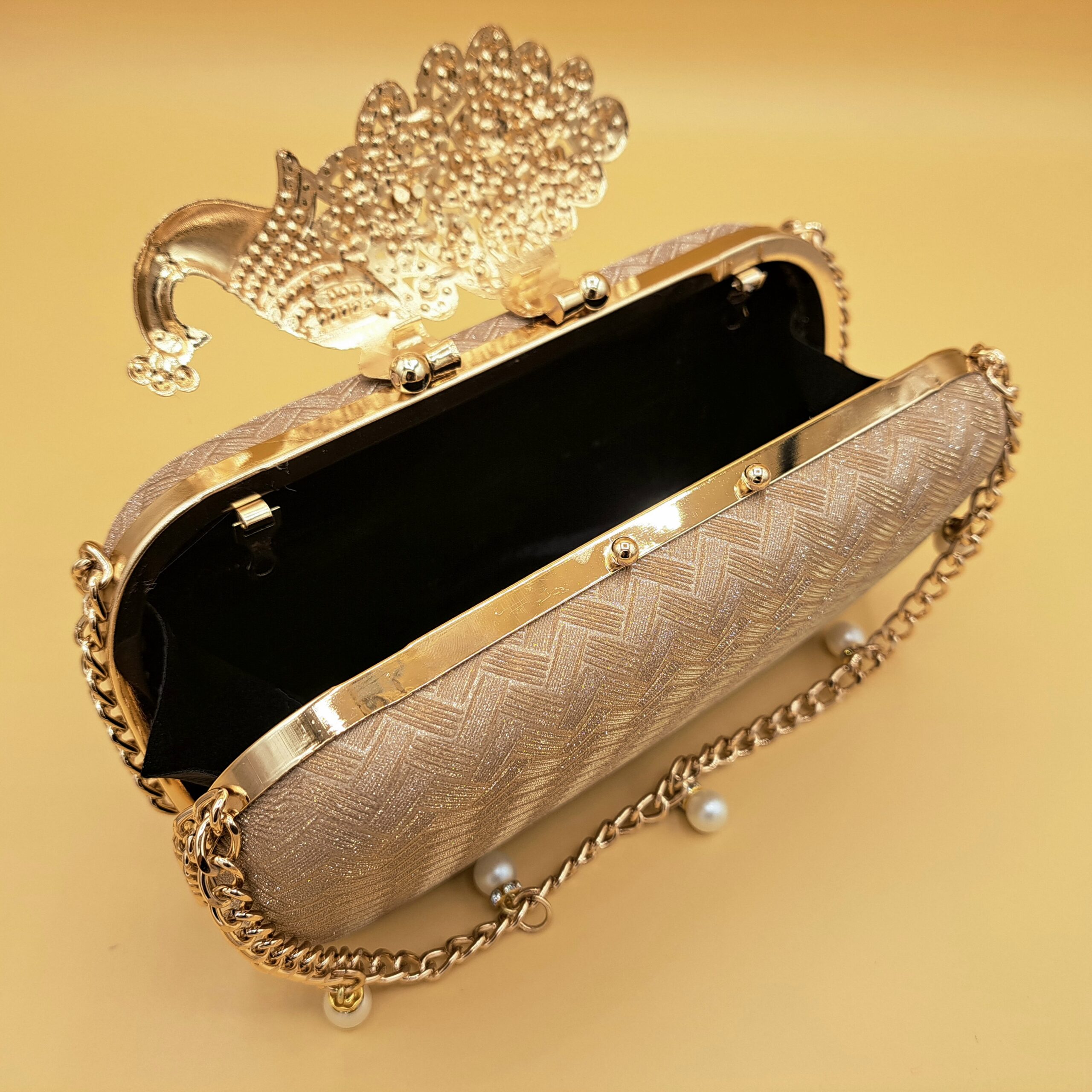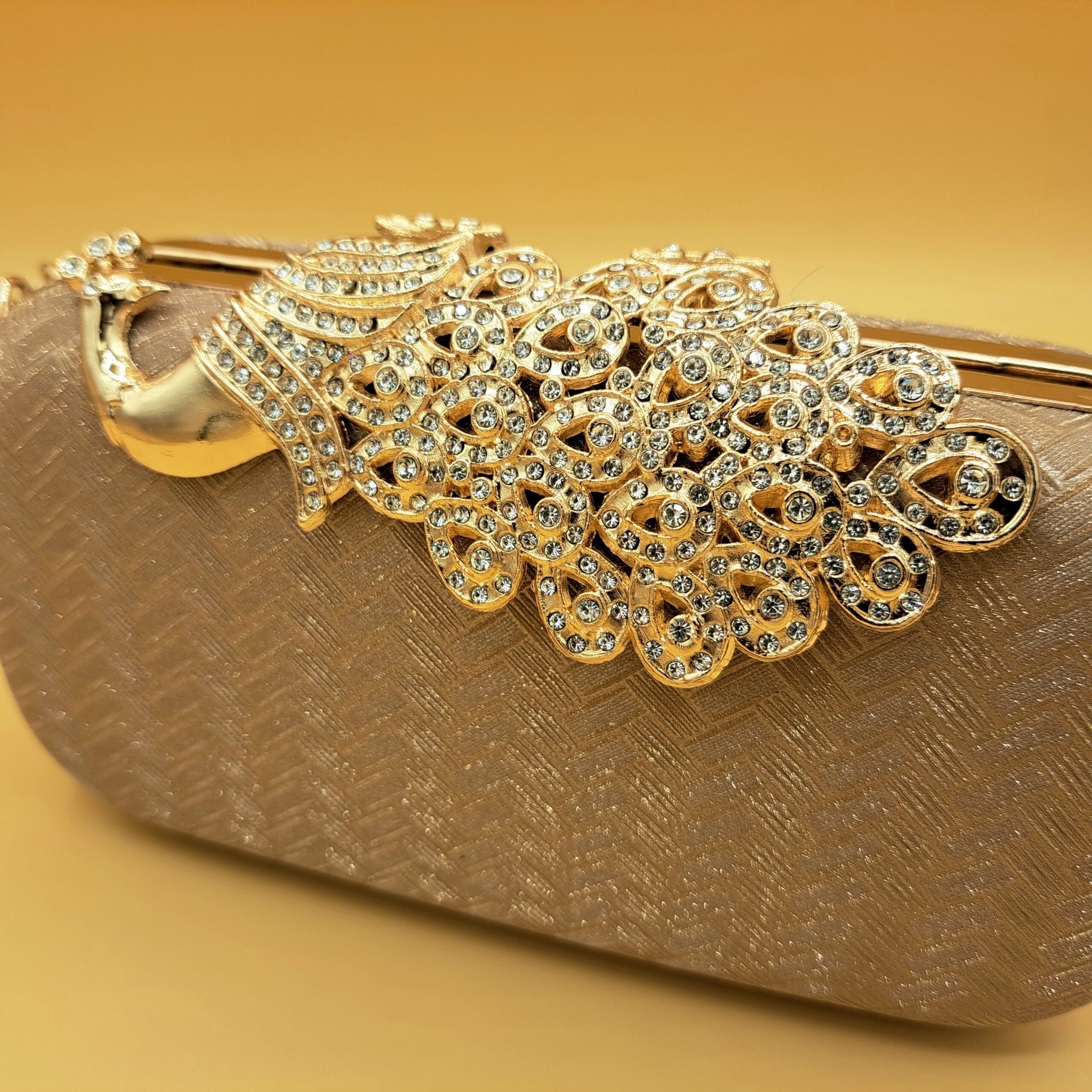 A statement of elegance — this gold-toned clutch features a stunning peacock design encrusted with shimmering stones and a chain hanging. Perfect for weddings and festive occasions, it pairs luxury craftsmanship with timeless charm.
