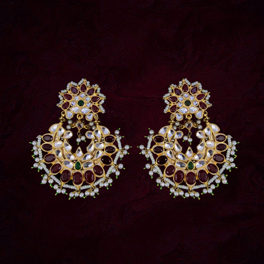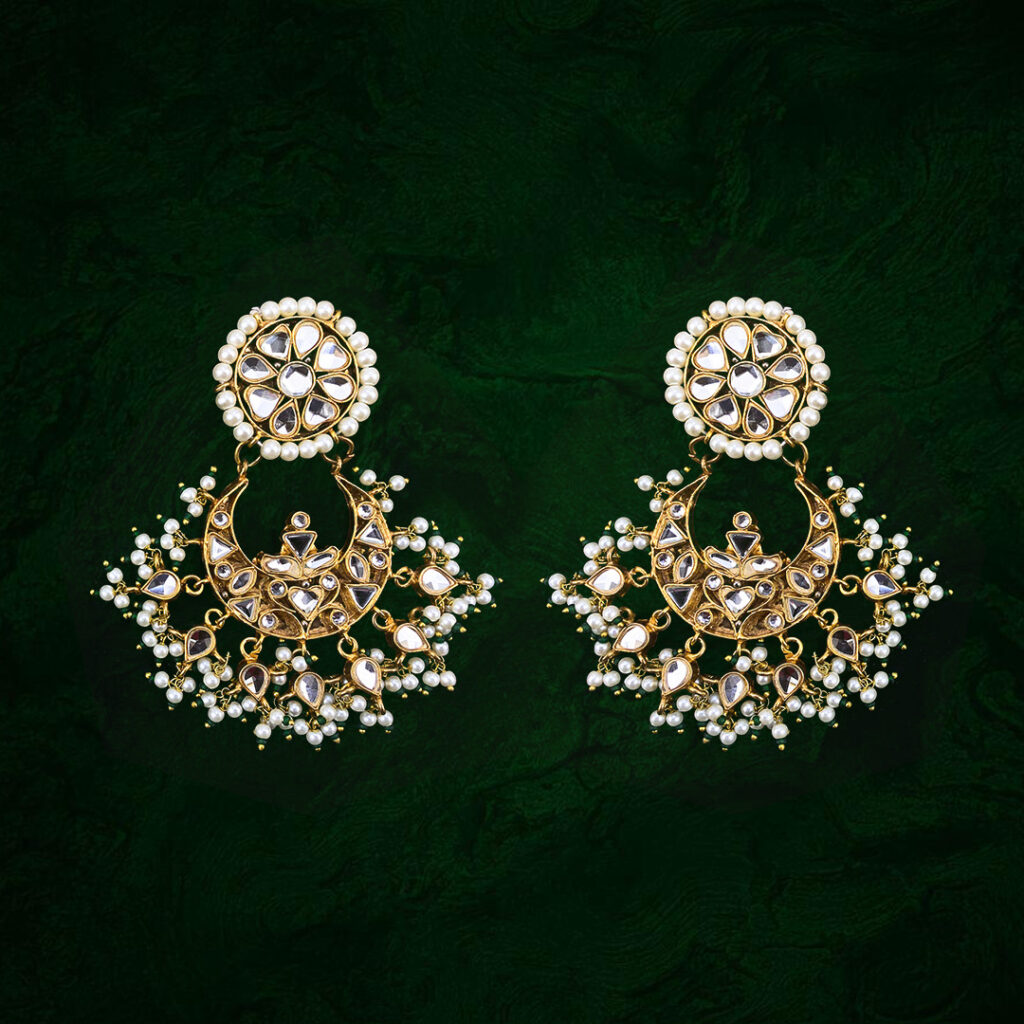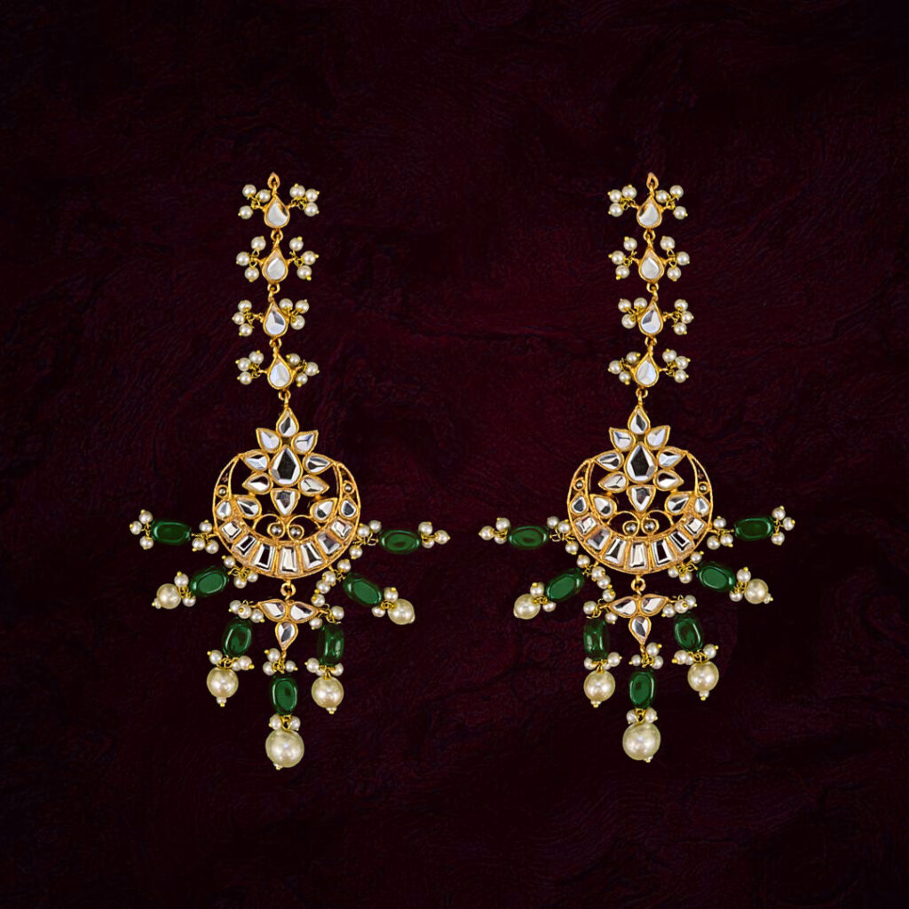 -Gold-plated handworked earrings embellished with kundan polki stones. -Gold-plated handworked bindia embellished with kundan polki stones.