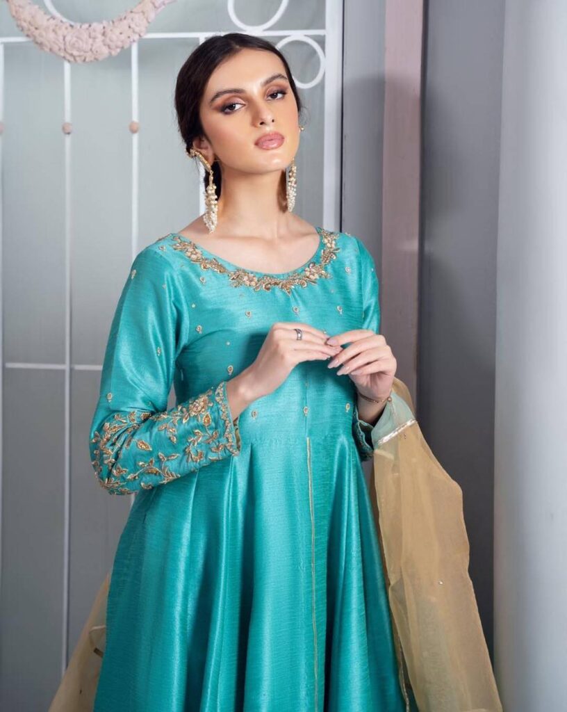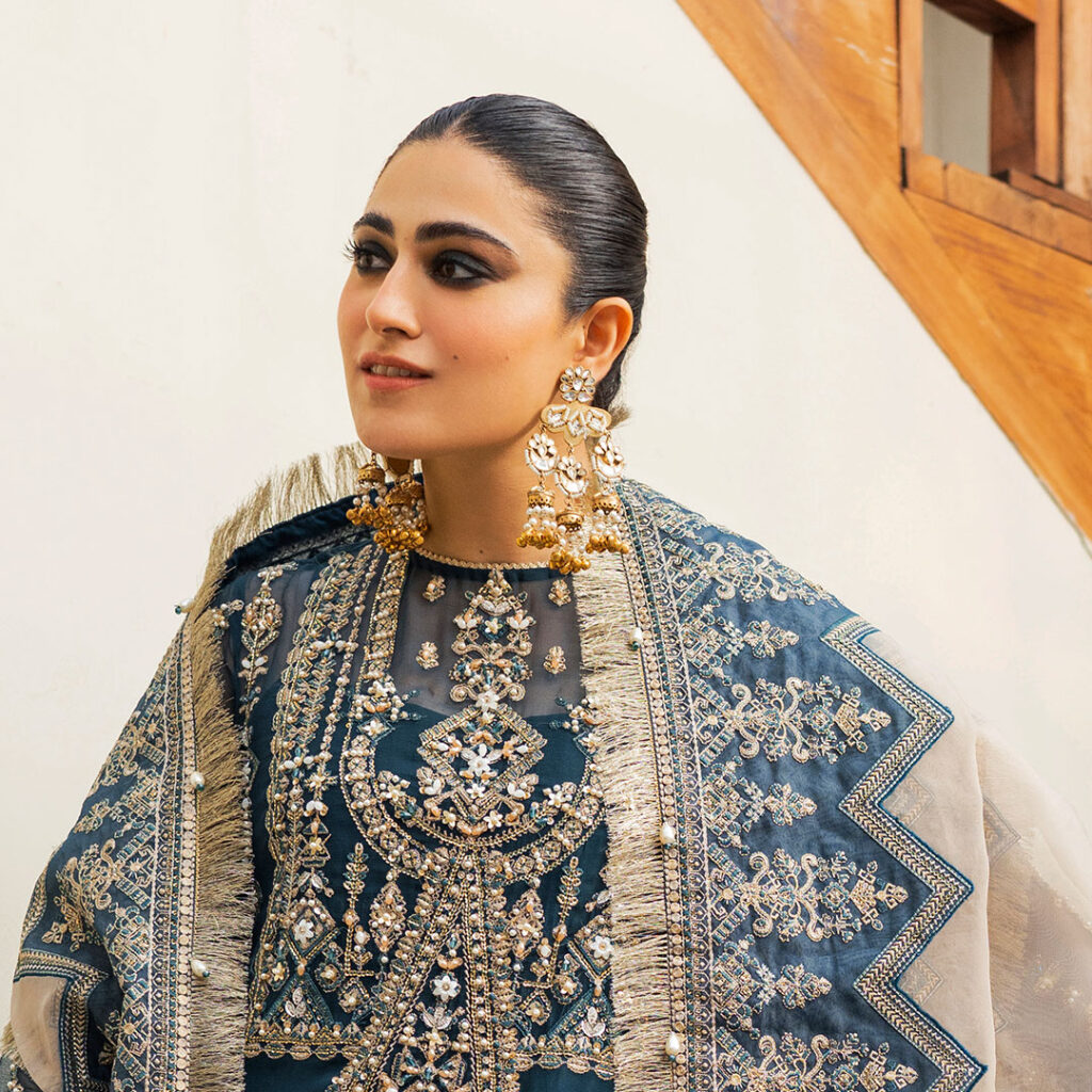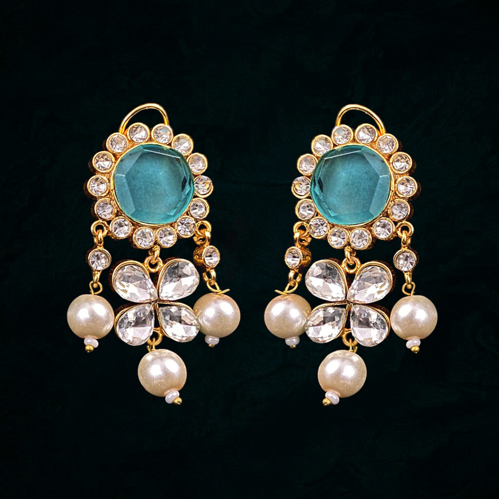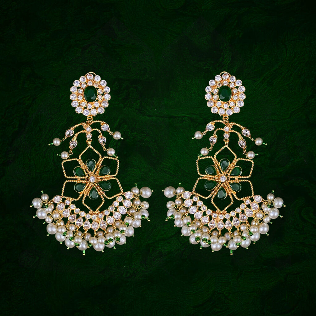 -Gold-plated handworked earrings embellished with kundan polki stones. -Gold-plated handworked bindia embellished with kundan polki stones.