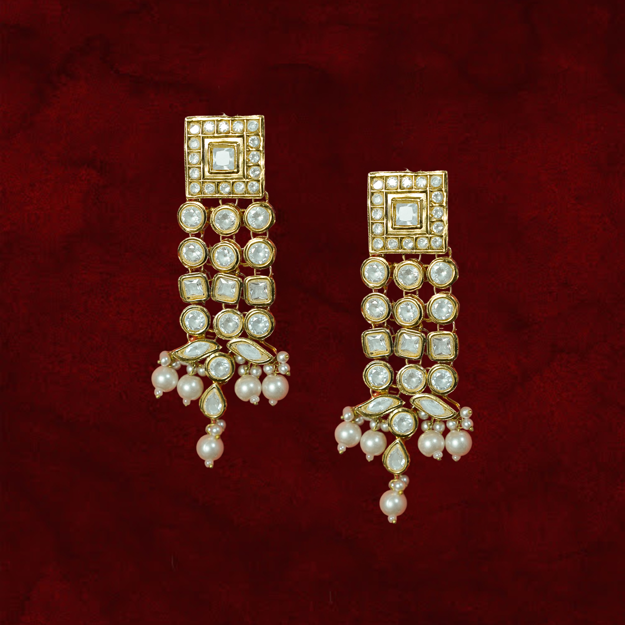 Exquisitely handcarved Goldplated polki earrings embellished with real zircon stones along with natural pearls embellishments.