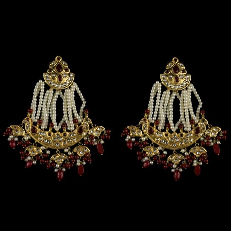 Gold-plated Thappa kundan-pearl jhumar shaped earrings embellished with fine kundan stones along with finishing of natural, ruby and ruby crystal pearls.