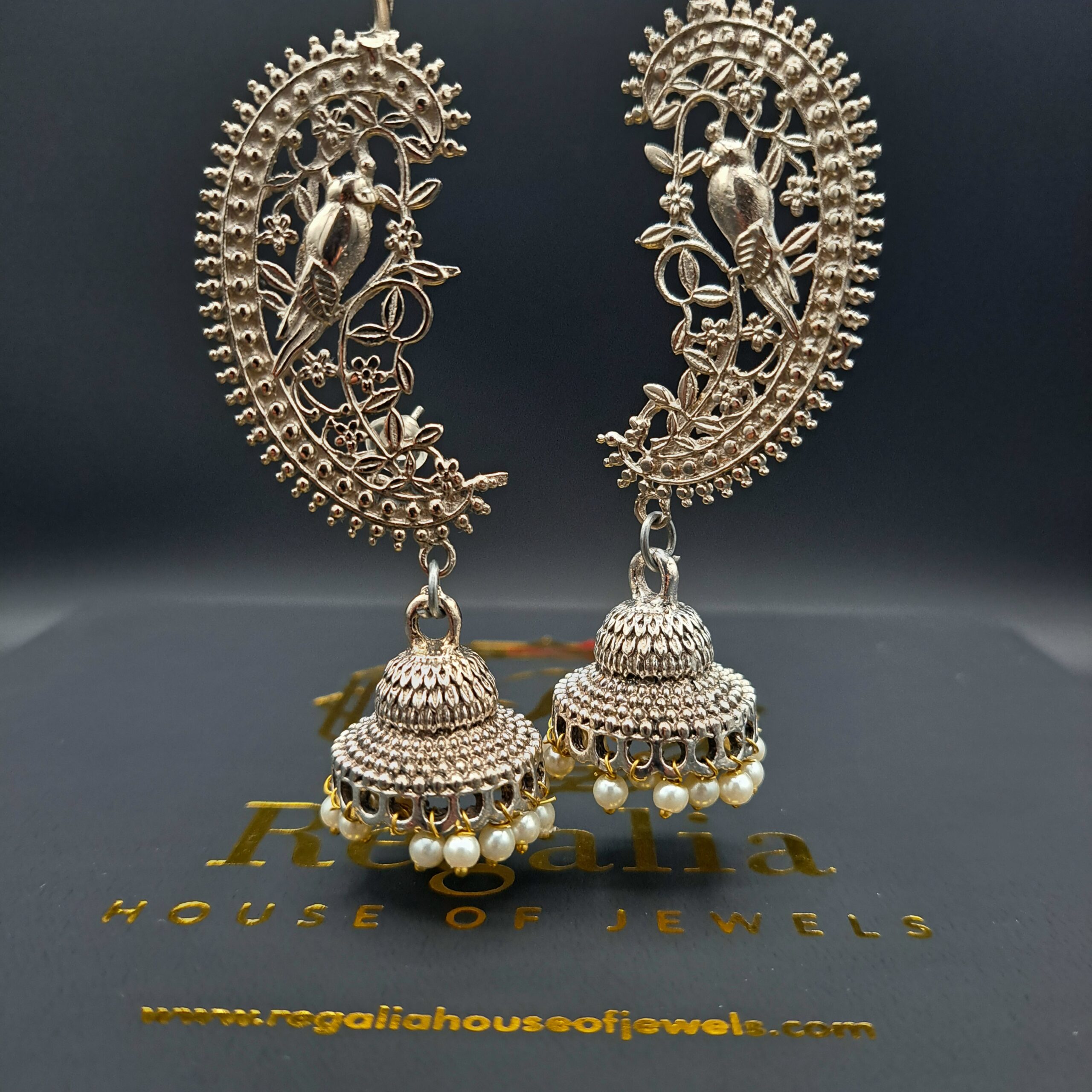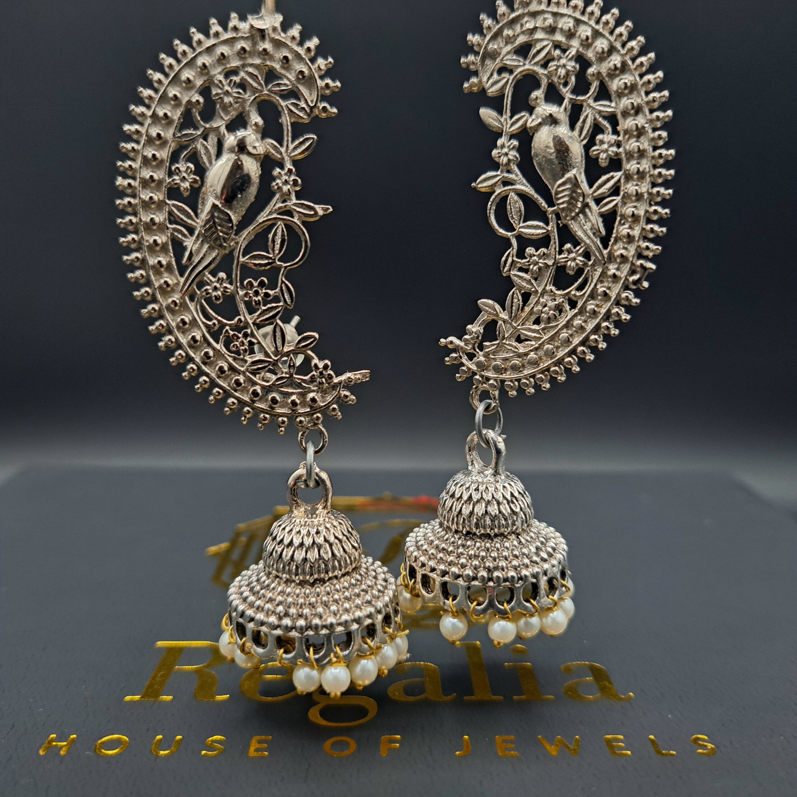 Intricate, silver-plated earrings with an oxidized finish. The top features elaborate filigree detailing in a half-moon shape, showcasing a charming bird and flower motif.