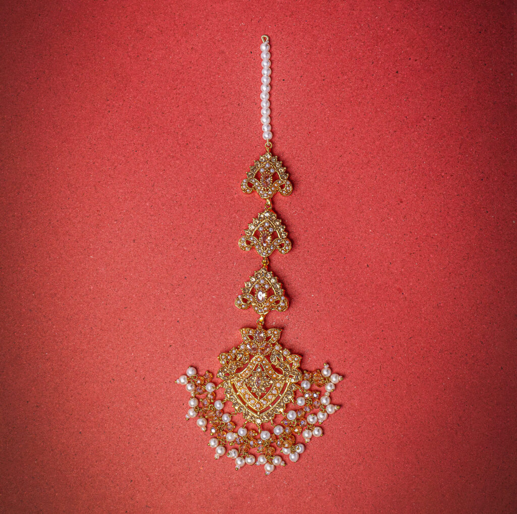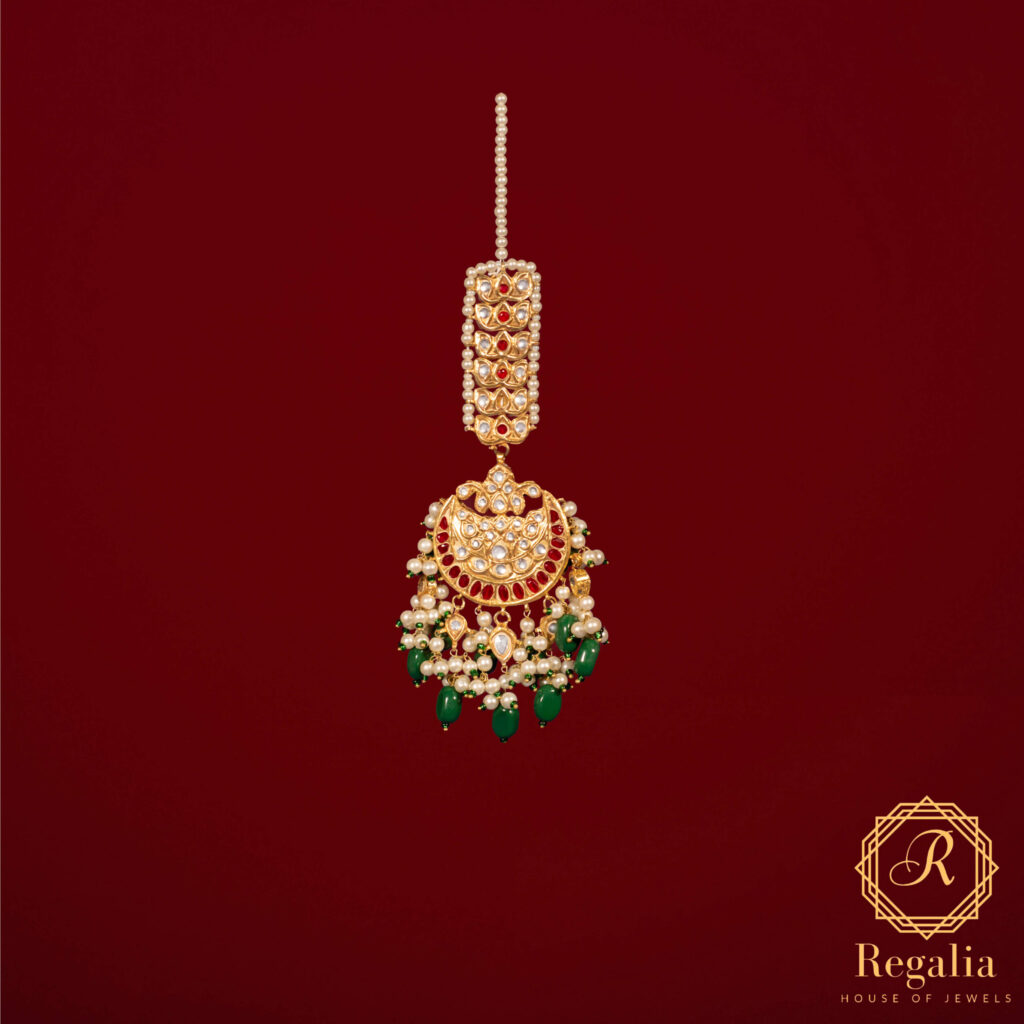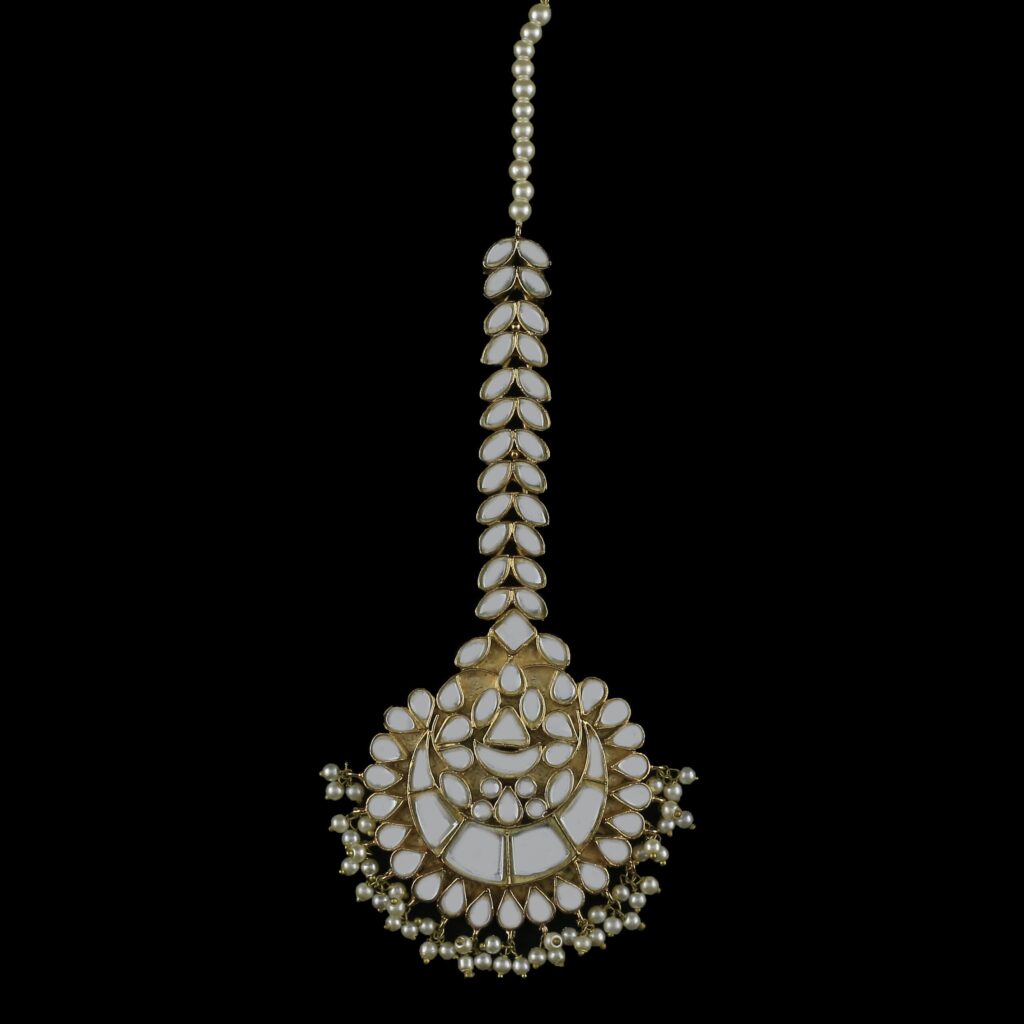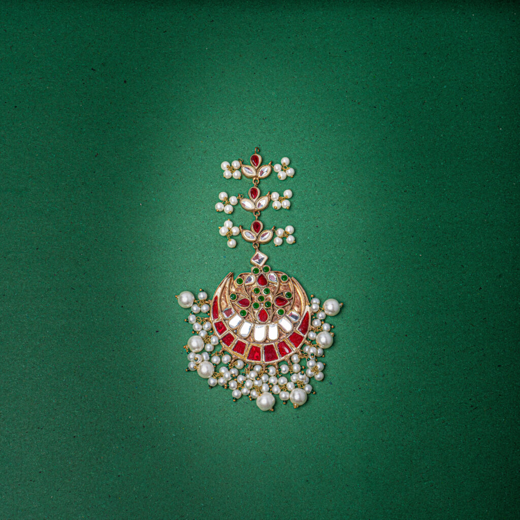 Handcarved Goldplated polki bindia embedded with kundan polki stones and heavily embellished with natural pearls.