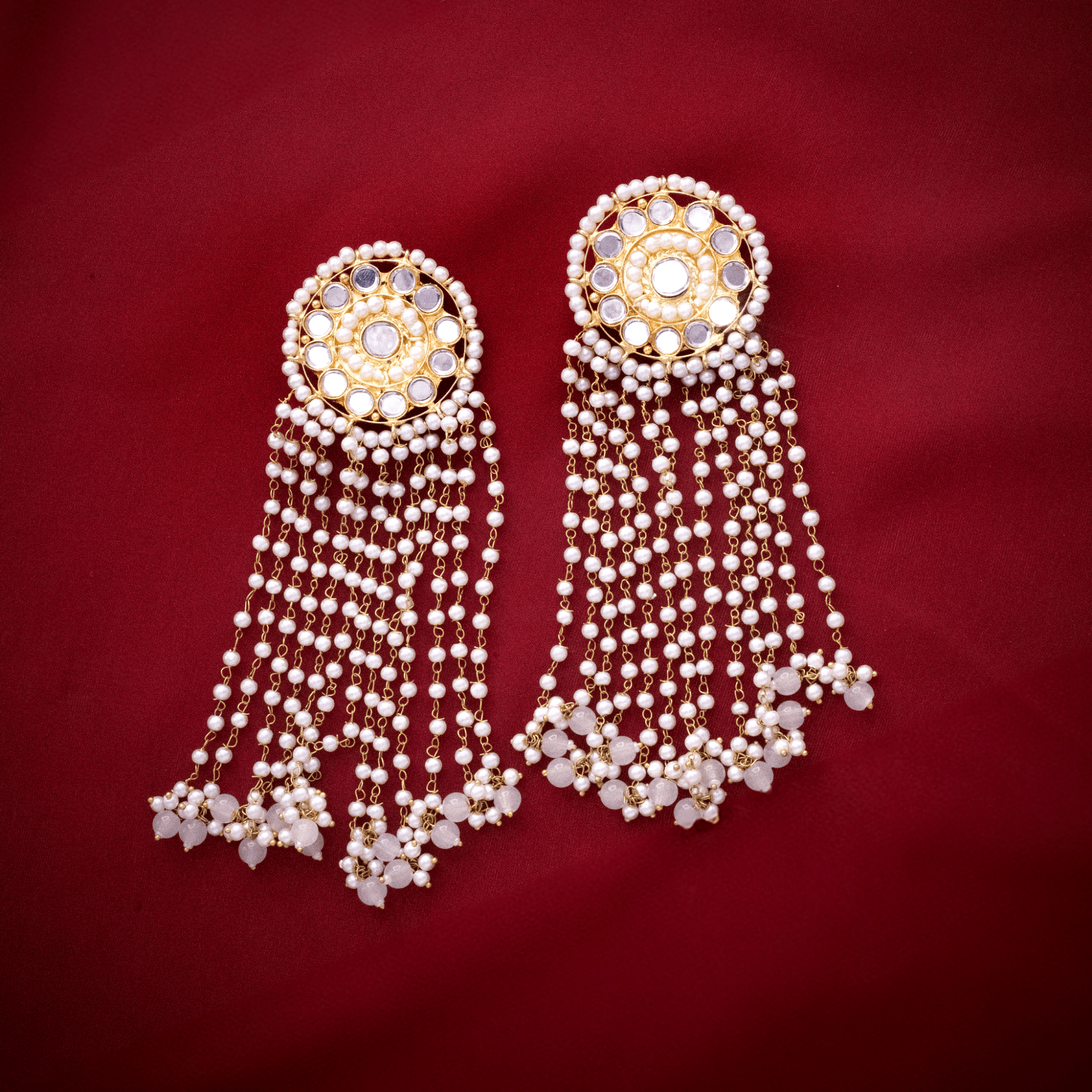 Gold-plated sheesha kundan earrings embellished with kundan stones heavily embellished with a long string of natural pearls.