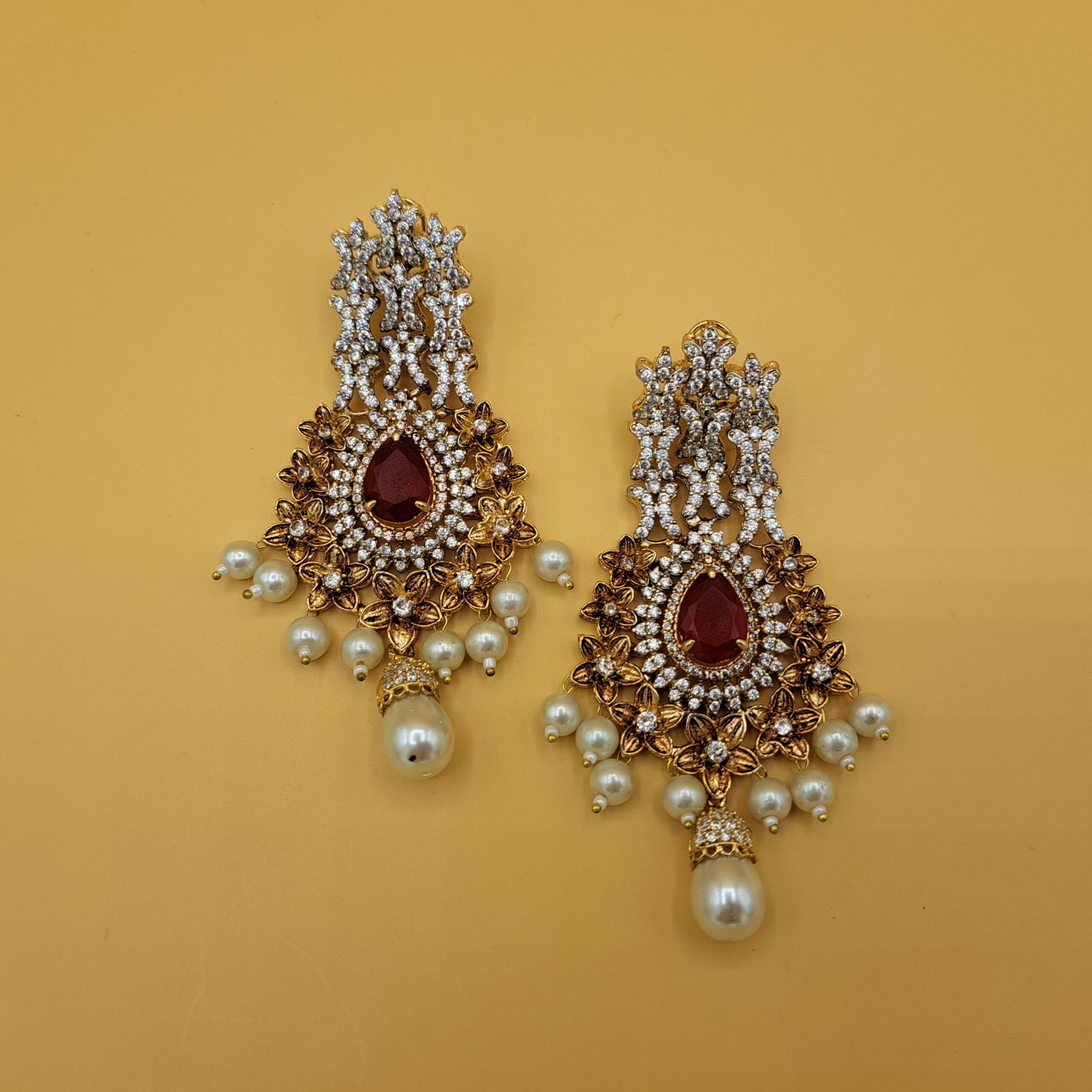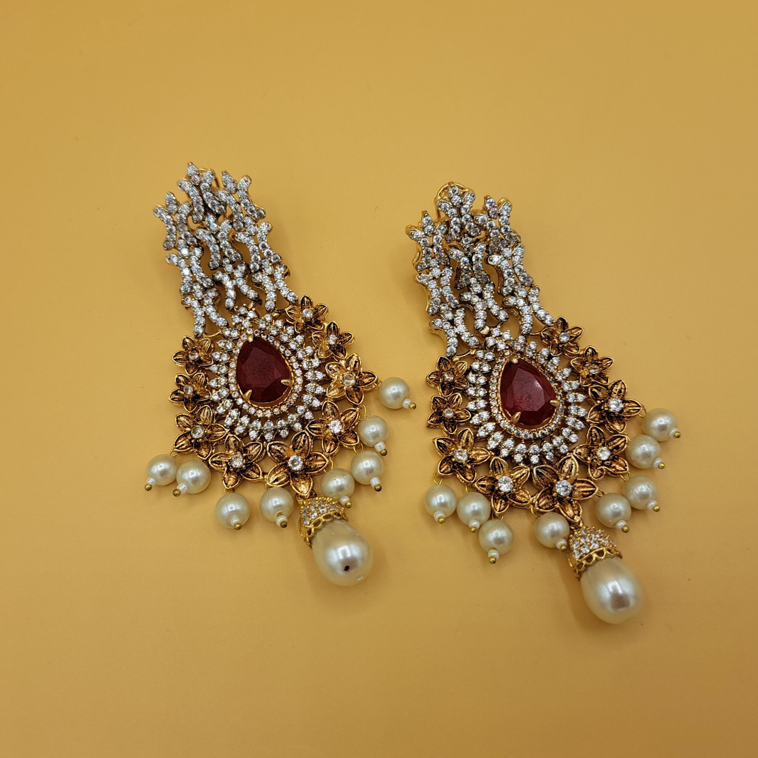 Goldplated handworked earrings finely embedded with real American zircon stones and centre ruby stones along with natural pearls embellishments.