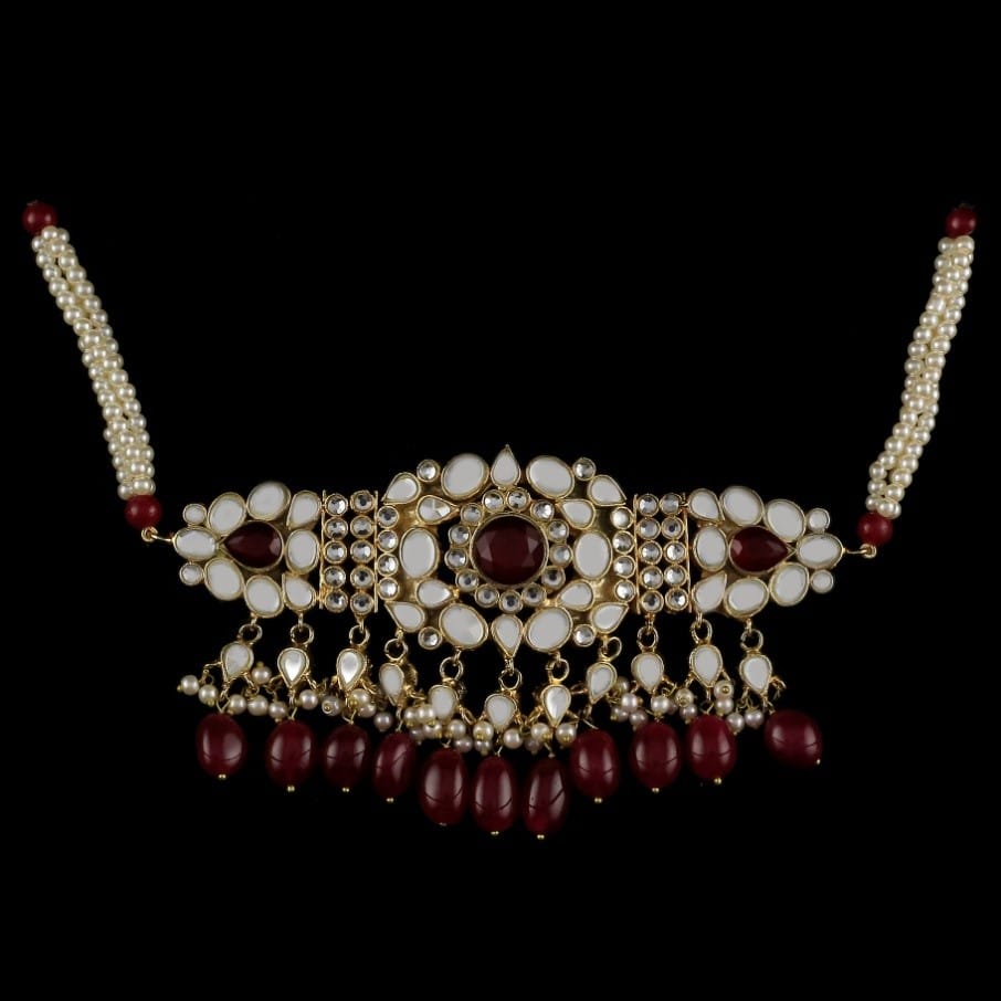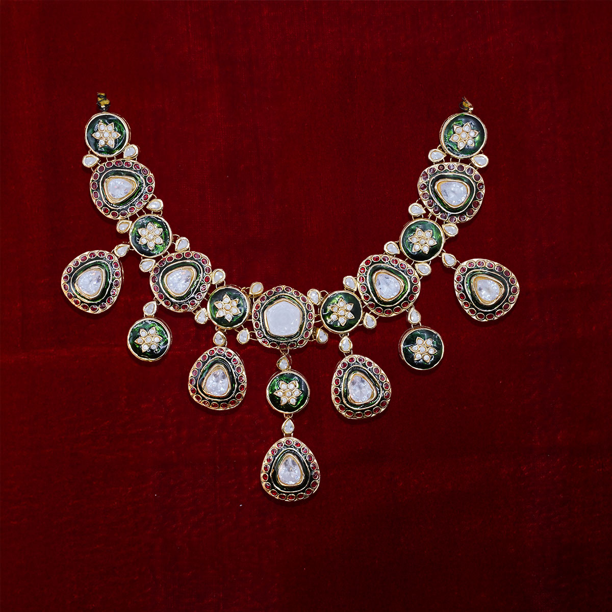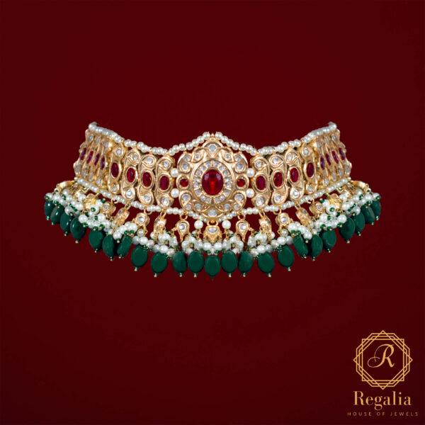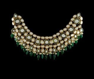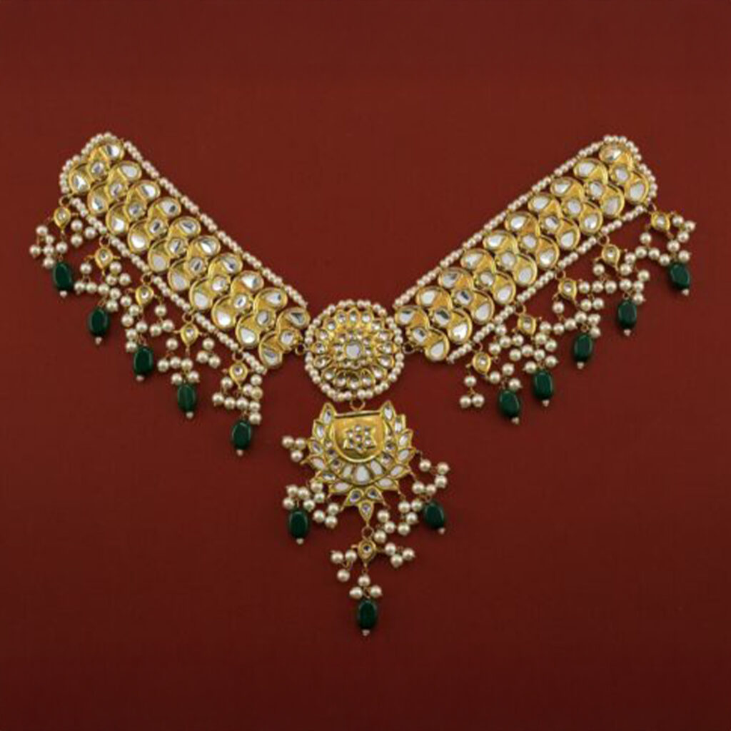 Virsa is a beautifully handcrafted gold-plated jewellery set inspired by traditional artistry. The set features an elegantly designed necklace, matching earrings, and a classic bindia, all finely embellished with kundan polki stones and rich ruby accents. Each piece is delicately carved with intricate emerald meena work, while the bindia is highlighted with a striking centre emerald stone, adding depth and regal charm to the design.