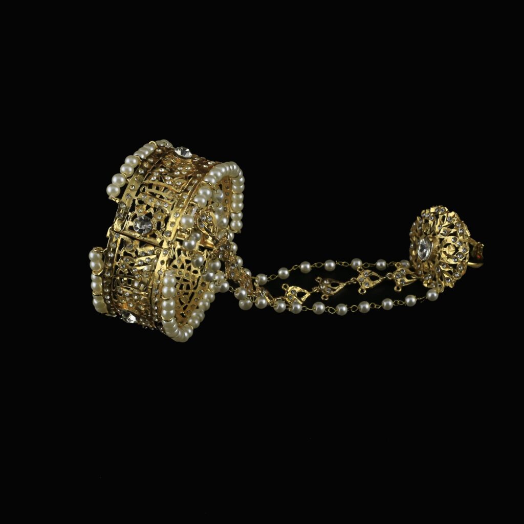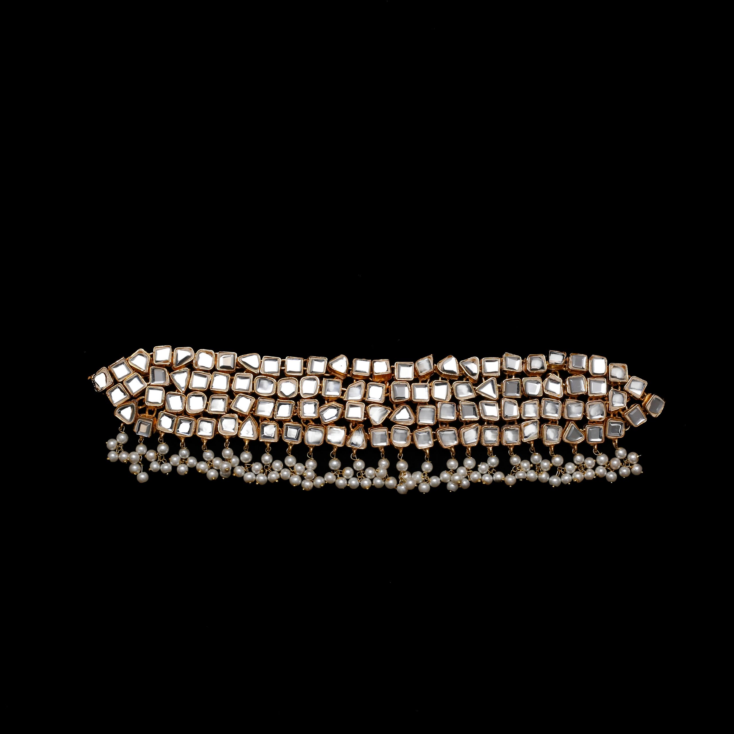 • Gold-plated Sheesha kundan choker embellished with white kundan stones, along with finishing of natural pearls.